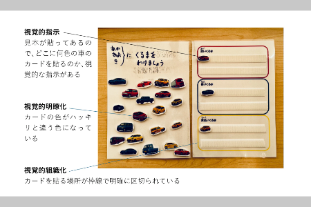 複数枚の絵カードを、いくつかのカテゴリーに分類する課題であれば、分類しやすいよう絵カードの違いがそれぞれハッキリわかりやすいものになっているか、分類するエリアが明確に示され組織化されているか、などを考慮に入れる必要があります🤔