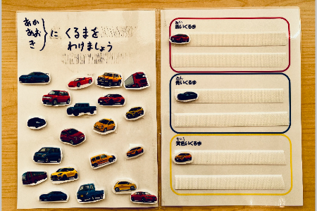 複数枚の絵カードを、いくつかのカテゴリーに分類する課題であれば、分類しやすいよう絵カードの違いがそれぞれハッキリわかりやすいものになっているか、分類するエリアが明確に示され組織化されているか、などを考慮に入れる必要があります🤔